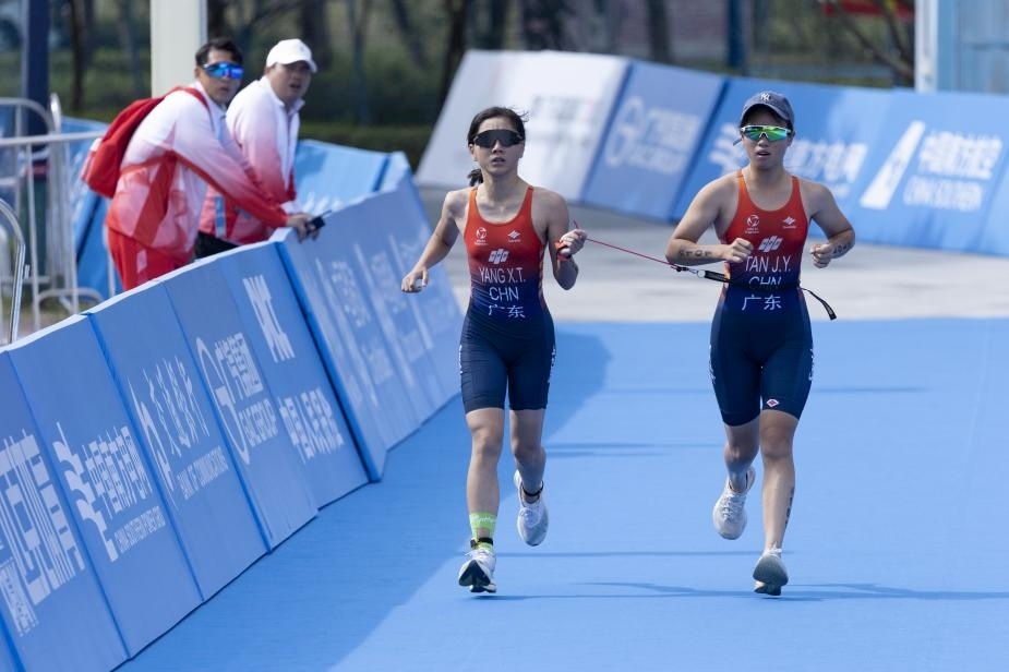 杨晓婷在相易员的牵引下完成“残特奥会”铁东说念主三项比赛